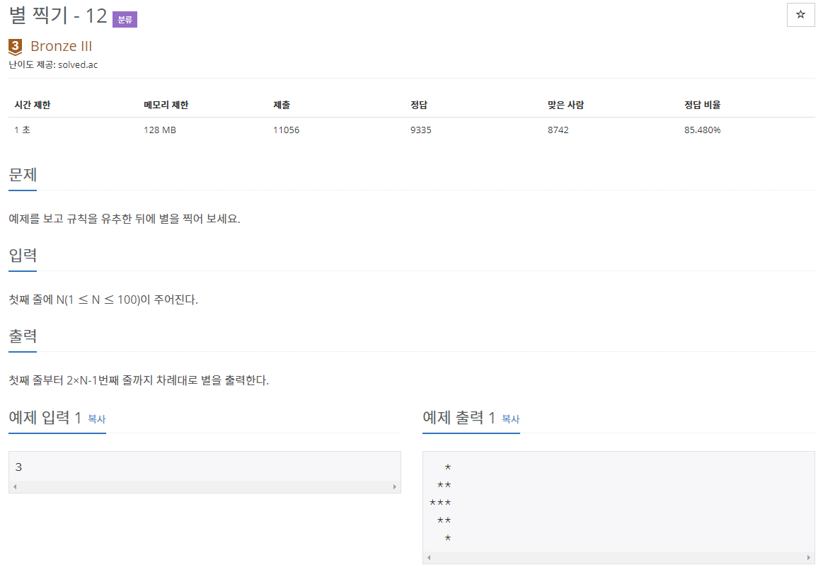 첫째 줄부터 2×N-1번째 줄까지 차례대로 별을 출력한다.